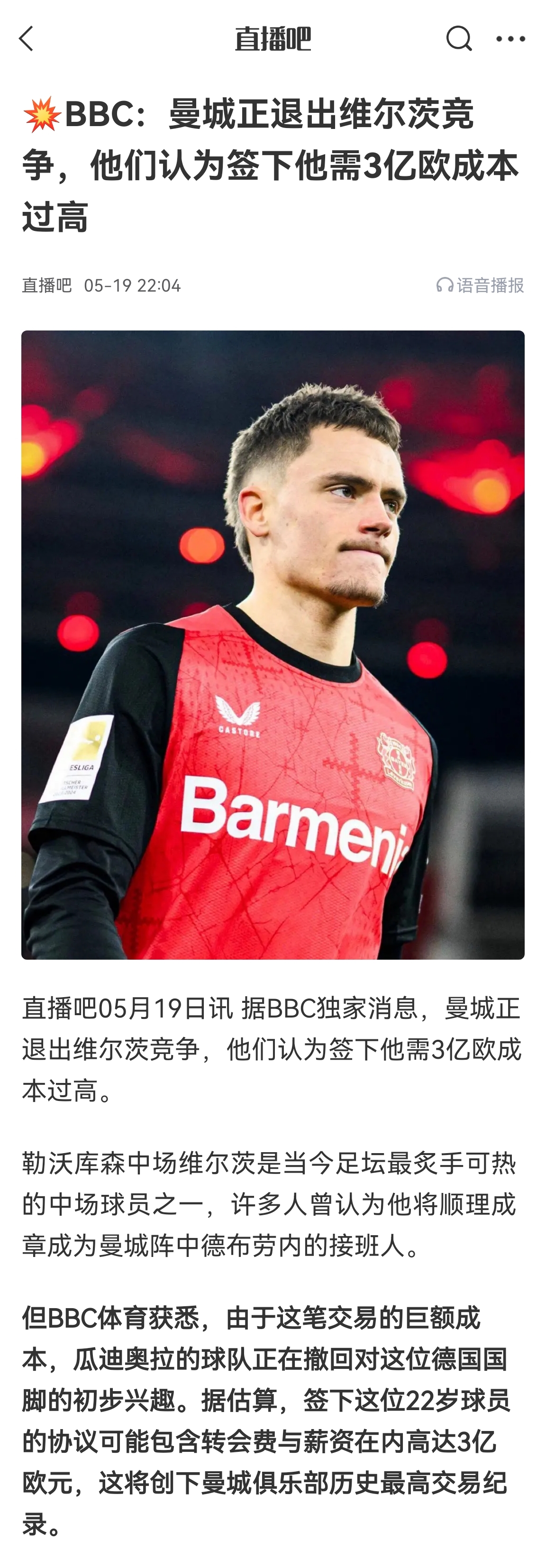 自5月19日因维尔茨转会费+工资总投入过高因而退出争夺以来,曼城接连签下了努里(4000万欧)、贝蒂内利(几乎免签)、切尔基(4200万)和赖因德斯(7000万),这四人的总转会费与维尔茨转会利物浦的费用(1.5亿)基本相等。